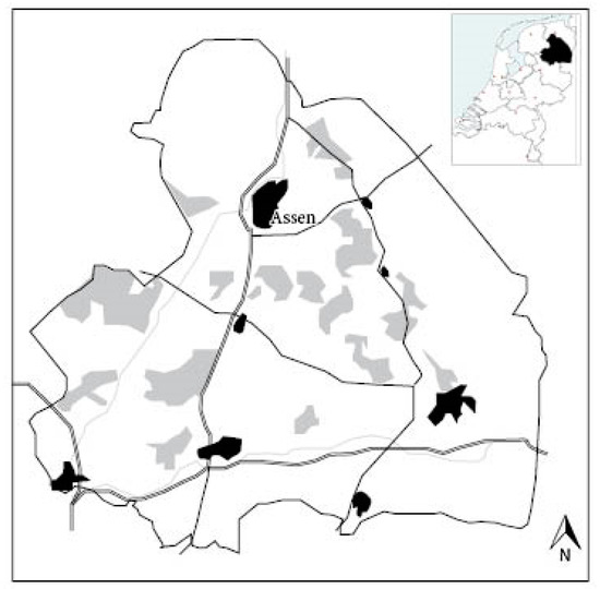 Province of Drenthe with urban areas (black), main road network (blacklines), nature areas (grey), and water (grey lines).