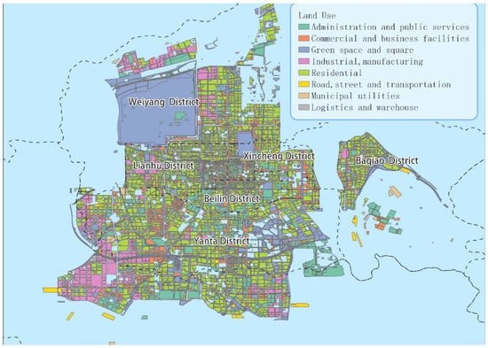 Xi’an is the capital of Shannxi province, a major city in the northwest part of China, with 8 million inhabitants. We chose six major districts as cases to empirically test the proposed evacuation modal choice model. Data were collected from several sources to and merged into an ArcGIS database for analysis. Land use data were collected from urban comprehensive planning as shown in Figure 1, socioeconomic and sociodemographic data were acquired from the Xi’an statistical bureau, and a stated preference questionnaire survey was designed to collocate the evacuee behaviors during an emergency evacuation.