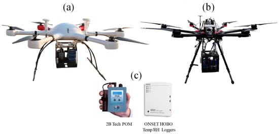 Portable instruments were mounted on the UAV platforms to measure air pollutant concentrations and meteorological parameters (Figure 1c). Vertical distributions of ozone were measured by a portable ozone monitor (Model: POM, 2B Technology, USA), which is based on ultraviolet absorption. Ambient air temperature (T) and relative humidity (RH) were measured during the flights using a meteorological sensor (Model: UX12, ONSET, Australia). Specific parameters of the instruments used in this study are summarized in Table 1. As shown in Figure 1, instruments were mounted or attached inside a carbon fiber cabinet. A section of Tygon® sampling tube was linked to the inlet of POM in order to introduce the ambient sample air. This tube is FEP-lined in order to reduce the ozone loss inside the tube. The portable instruments installed on the two UAV platforms were identical. For detailed information about the UAV platform and instruments, the reader is referred to Wang et al. [21].