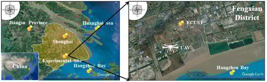 The annual means of accumulated precipitation and surface air temperature of Shanghai is 1166.1 mm·yr−1 and 16.0 ℃, respectively [36]. The field campaigns were carried out over grassland in Feng’xian District (30°48′53″ N, 121°29′37″ E). The experimental site (Figure 2) is situated about 2 km to the southwest of the Feng’xian Campus of East China University of Science and Technology (ECUST). The experimental site is surrounded by suburban and bay area. A large chemical industry is about 2 km southwest from the site. During the study period, the average surface air temperature decreased from about 14 ℃ in November to about 7 ℃ in December. In addition, the experimental site mainly experienced sunny or cloudy weather, with a dominant wind from the north and northeast.