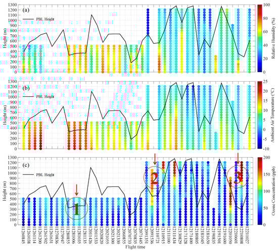 Vertical profiles of (a) Relative humidity (RH), (b) ambient air temperature, and (c) ozone concentration measured by the UAV platform from 08:45 LT on 26 November to 10:27 LT on 11 December, 2017. Each label of the horizontal axis represents the profile number, which consists of the date and the exact takeoff time of each flight. The planetary boundary layer heights are shown as black solid lines. The original PBL data were obtained from the NOAA Archived Meteorology. A low-order linear interpolation method was used to calculate the estimated the PBL height during each flight period.
