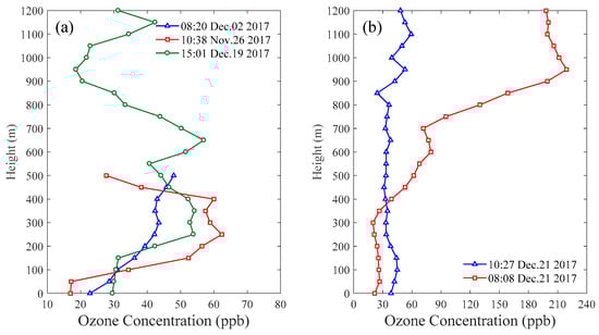 As shown in Figure 3, the PBL height ranged from 200–1300 m from November to December, 2017. Consequently, the UAV platforms in this study are reliable and practical to capture the vertical variations of ozone within the lower troposphere in the wintertime.