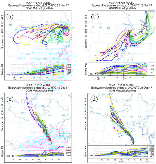 The 48-h backward trajectories starting at 10:00 LT on (a) 26 November, (b) November 28 at 300 m; 48-h backward trajectories starting at (c) 09:00 LT on 11 December, and (d) 08:00 LT on December 21, 2017 at 800 m. Figures courtesy National Oceanic and Atmospheric Administration (NOAA) Air Resources Laboratory.