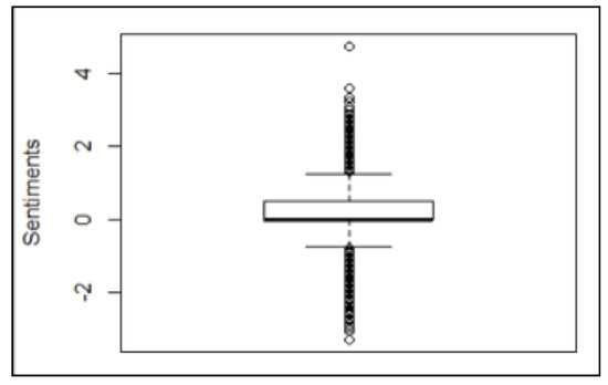 In order to construct the `Sentiments’ variable from unstructured data (tweets), we executed some pre-processing tasks using the software R. At the first stage, R served to clean each tweet by removing punctuation and stop words, converting words into lower case, striping any leading or trailing spaces and for privacy reasons, setting all participants’ addresses into `@user’. At the final stage, R categorizes each structured tweet into a numerical positive or negative value between and 5 that defines the importance of a tweet with positive scores indicating positive sentiment and negative scores indicating negative sentiment on a given day. For example, the most positive sentiment got a score of 4.75 from the tweet “Watch it! An amazing truth. How the brain works. If you like it Share it Please Awesome information SP&500 #amazing #unbeliev”, and the most negative sentiment was valued at from the tweet “In a pathetic attempt to avoid panic selling S&P; a stock market crash, the Trump administration wasted $130 billion of tax”. Figure 1 shows the distribution of each tweet sentiments throughout the analysed period. The Box-plot distribution indicates both positive and negative sentiments, in which most of the market participants can be viewed as bullish.