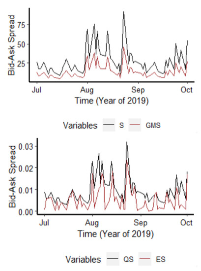 Market participants who seek to make an immediate trade would possibly trade at the best available price, i.e., the bid price if buying or the asking price if selling. The bid–ask spread has gained huge interest among market participants due to the fact that it is a significant measure of trading costs and thus a proxy for financial market liquidity [20,56,57,58,59]. The size of the spread reflects an asset’s liquidity, i.e., the ease and cost of trading an asset.