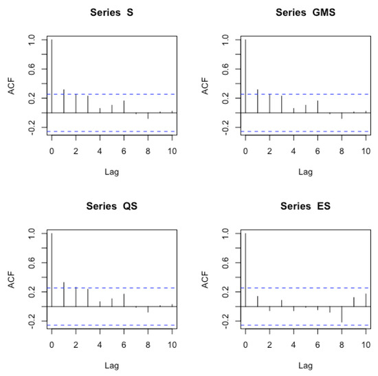 We have performed an autocorrelation analysis to study whether the time series are linearly related to lagged versions of themselves. Figure 4 shows the autocorrelation plot for each liquidity measure. We observe that values are within 95% confidence interval (represented by the dashed blue line) for lags > 1, but lag = 1 falls outside this confidence interval. So that, we can conclude that all liquidity measures are serially correlated, and this must be considered in the regression models by including the lagged computation of the liquidity measure (Equation (6)).