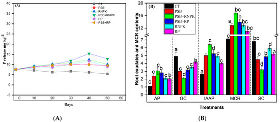 Effect of phosphorus solubilization bacteria (PSB) on the phosphorus (P) release with the passage of time (days; 10 days to 50 days after plant emergence; (A) and some root exudates (AP, GC, IAAP, SC) and moisture contents of rhizoseath (MCR; %) (B). All the bars (B) having similar betters among the other bars are not signifincalty similar according to DMR test (p ≤ 0.05) while the error bars show the standard errors of the mean values. AP, auxin production (mg mL−1); GC, glucose contents (µg g−1); IAAP indole acetic acid production (µg mL−1); and SC score contents (µg g−1). CT, control; PSB, phosphorus solublization bacteria; PSB + RNPK (PSB + recommended nitrogen, phosphorus and potash), PSB + RP (PSB + rock phosphate).