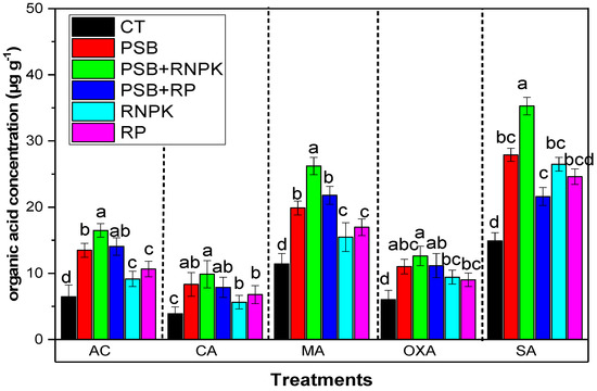 The current study indicates that PSB inoculation increases the organic acids in the rhizosphere compared to non-inoculant control (Figure 2). Moreover, the maximum organic acid was produced in the PSB addition together with RNPK in the sandy soil as compared to control and all other treatments RP alone, or PSB alone, or PSB together with RP. The data in Figure 2 show that AC by 155%, CA by 153%, MA by 129%, OXA by 39%, and SA by 137% was increased over the non-inoculant control. Moreover, when we compared the PSB treatments, PSB alone and PSB together with RP decreased the organic acid concentrations by 22% and 17% (AC), 19% and 25% (CA), 74% and 91% (MA), 25% and 33% (OXA), and 26% and 63% (SA) as compared to PSB together with RNPK, respectively (Figure 2).