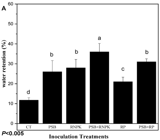 The results of the current study indicate that fresh PSB together with RNPK significantly increases soil water retention (Table 9), relative to the RP alone or PSB alone or CT (non-inoculant control). These results are supported by a number of other studies [68,69]. The difference observed in higher water retention in PSB together with RNPK might be due to slow water movement by PSB colonialization in the column (Figure 3A) against different time durations compared to other treatments. Interestingly, it was observed that the water-staying time at head height was higher over other PSB alone and RP alone treatments, resulting in slow water drainage into the column.