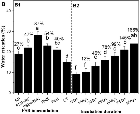 The PSB inoculation treatments, duration, and their interactive effects significantly affected the sandy soil water retention (Figure 3A,B). The study results exhibit that PSB together RNPK is the most effective treatment over all other treatments towards the increase of water retention. The incubation duration of fresh PSB inoculants also increases soil water retention (Figure 3B). This phenomenon of our study indicated that a fresh application of PSB to sandy soil also increased the sandy soil water retention over time (days) and supported early maize growth and development for a certain period of time. So, among all treatments, the interactive effects (Figure 3B, B1 and B2)) show that PSB + RNPK and the 75 or 90 days of fresh incubation is helpful to farmers. So, the water retention ability of the treatments are in the following order: PSB + RNPK > PSB + RP > RNPK ≥ RNPK > control. However, the incubation duration (days) also increased the water retention of fresh PSB inoculation in the following order: 90 days ≥ 75 days > 60 days > 45 days > 30 days > 15 days ≥ 0 day.