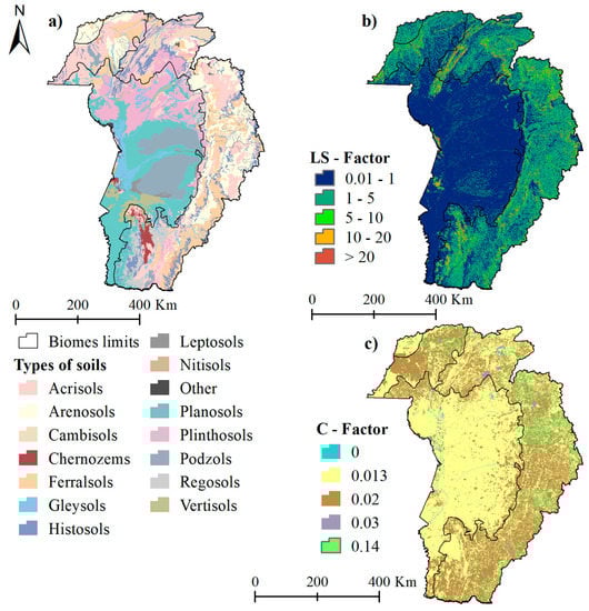 Figure 3c shows the distribution of the C-factor in the studied basin according to the land covers: water (0); savanna and forest (0.013); pasture (0.02); planted forest (0.03); urban area (0.03); agriculture (0.14); and regeneration (0.02). The highest C-factor values are predominantly in the eastern UPB, where there is a predominance of agriculture in the Cerrado and Amazon biomes. Finally, we assigned a value of 1 to the P-factor considering the non-existence of conservation practices in the study area.