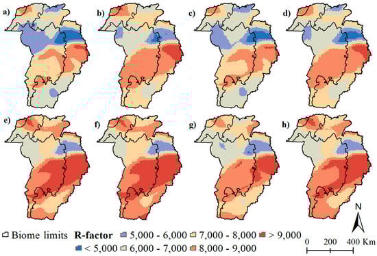 Projected rainfall erosivity (R-factor in MJ mm ha−1 h−1 yr−1) for the UPB from (a) Eta/HadGEM2-ES RCP 4.5 (2012–2040); (b) Eta/HadGEM2-ES RCP 4.5 (2041–2050); (c) Eta/HadGEM2-ES RCP 8.5 (2012–2040); (d) Eta/HadGEM2-ES RCP 8.5 (2041–2050); (e) Eta/MIROC5 RCP 4.5 (2012–2040); (f) Eta/MIROC5 RCP 4.5 (2041–2050); (g) Eta/MIROC5 RCP 8.5 (2012–2040); and (h) Eta/MIROC5 RCP 8.5 (2041–2050).