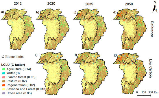 We estimated C-factor values based on experimental plots [29] and then attributed these values to the land-cover and land-use (LCLU) classes developed by Soares-Filho et al. [6,30] (see Figure 3c). The projections of LCLU changes are based on the contribution of agriculture, forestry, and other land use (AFOLU) activities to Greenhouse Gas Emissions (GHG). In these projections, two scenarios are considered. The first is called the reference (REF) scenario and is characterized by the development of AFOLU activities without significant changes in their trajectory. The second, the low carbon (LC) scenario, includes technically possible mitigation measures to be implemented, and considers the transition towards lower carbon intensity practices for the activities.
