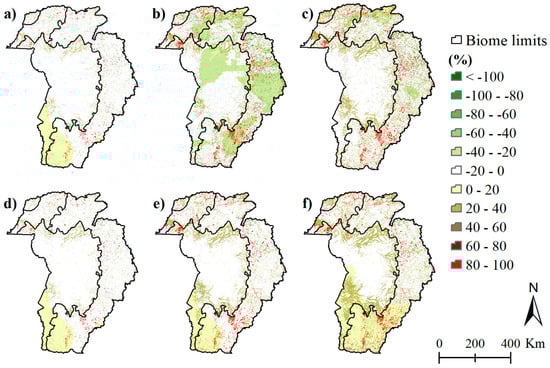 Figure 6 shows the relative variation of the average soil loss projected for 2020, 2035, and 2050, related to the baseline for the best and worst scenarios. For all cases, the greatest variations of soil loss (80 to 100%) are concentrated in the Cerrado and Amazon biomes (highlands). We found that this variation occurs mainly in areas of agriculture expansions. In the Pantanal biome, in general, the variation is up to 40% in all periods, despite the fact that there are some areas near the Amazon with a variation of 80 to 100%. However, this variation intensifies from 2035 to 2050 (see Figure 6e,f). On the other hand, there are negative variations concerning the baseline, indicating a possible reduction of soil erosion. Figure 6b shows a variation of −40 to −20% in the north of Pantanal and parts of the Cerrado, associated with the decreasing values in rainfall erosivity.