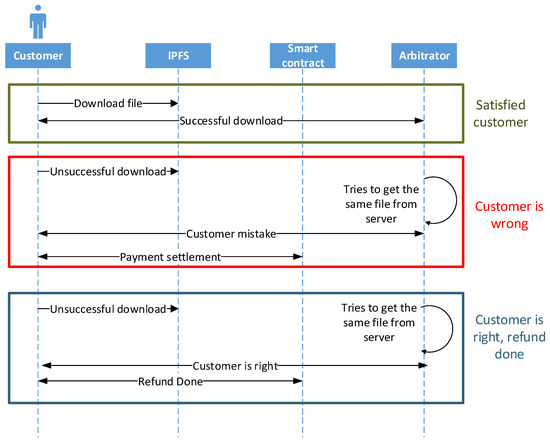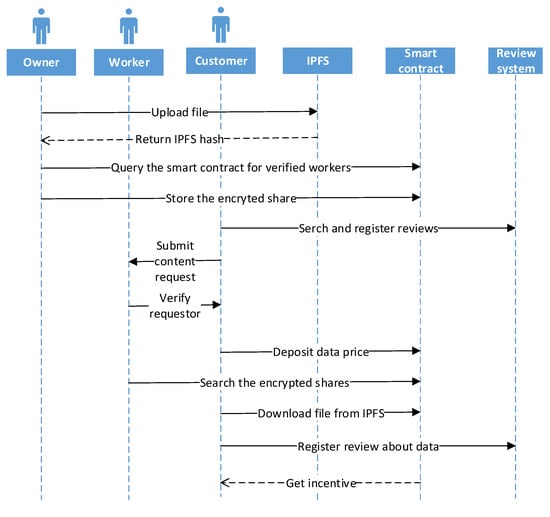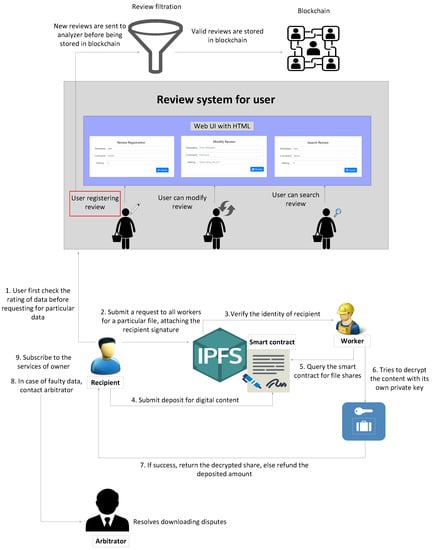 A detailed system model for customer requesting the digital content is shown in Figure 2. A customer first checks the existing review of data by previous customers, so that quality of data can be properly verified before depositing the ethers. The details of review system are going to be discussed in Section 5.2.1.