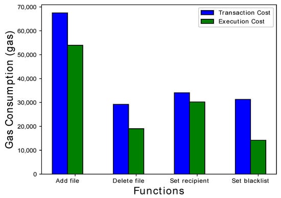 Table 2 refers to the gas consumption values for multiple functions executed in smart contract. After one time deployment of IPFS storage smart contract, the transaction and execution gas is recorded as 1,808,235 and 1,338,219, respectively, which are noticed to be unchanged after multiple transactions. Here, the transaction cost is the amount of gas required to send data on blockchain network and execution cost is the computational fee required to execute the function. The actual cost is measured as $0.55 USD for the contract creation. When an owner uploads a file to server, addFile function performs the operation costing $0.016 USD as the actual cost. Similarly, when any file is deleted from the system, deleteFile function is invoked. As a result, the ConfirmFileDeletion event is triggered. The actual cost for the execution of this function is recorded as $0.0088 USD. The recipient list maintains the record of authorized requestor who are validated by workers. Whenever a new requestor gets authenticated, it becomes a part of this list and setRecepient function is executed. Execution of this function costs $0.0091 USD. Requestors which are not authorized and authenticated by workers are stored in blacklist for future reference. So that, whenever, any person tries to send a data request to owner, its request will be immediately discarded by the system. As a result, setBlacklist function is executed which has a recorded cost of $0.0043 USD. Gas consumption for all aforementioned functions is given in Figure 7.