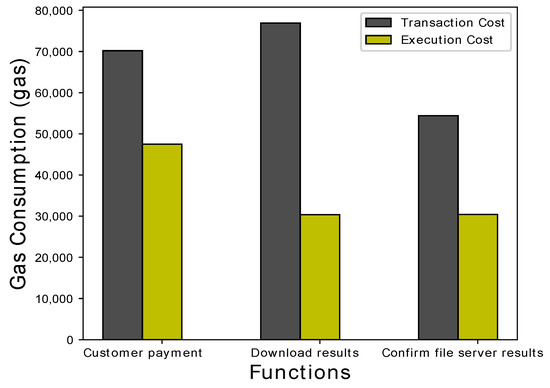 To run the corresponding smart contracts, the gas price is adjusted to 2 Gwei. 1Gwei is equivalent to wei, which is approximately ethers. The cost measured for smart contracts are given in Table 2 and Table 3.