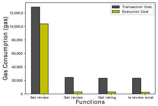 The review system smart contract is deployed on Ethereum platform. To deploy any contract, specific amount of gas is required. The maximum limit of gas is pre-decided by creator, which is 3,000,000. Two types of gas consumed is observed; transaction gas and execution gas. In Figure 10, the highest gas is consumed by Add file function, as uploading review file on the system requires time and cost. The amount of gas varies depending upon the size of file to be uploaded on the review system. The rest of the operations, such as, get review, get rating, is review exist show the minimum cost, as they does not require some additional uploading. These functions just search the already existing review and their rating from the system. Execution cost depends upon the number of lines of codes and the logical operation being performed within the function. Ethereum yellow paper [6] is referred to check the gas consumed for different types of operations.