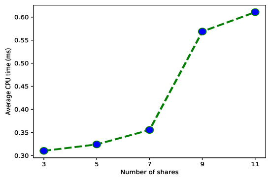 Figure 11 represents the average computation time of CPU against the number of shares generated in SSS. It is evident from the graph that as the number of shares increases, the average CPU time increases exponentially. In this scheme, when , the shares are generated with polynomial whose degree increase with every additional k in the system. The highest computation time is recorded as 0.66 ms when k is equal to 11 shares and 0.32 ms is the lowest computational time when number k is 3. Higher the number of shares, more is the increase in computational complexity because greater the number of secrets, the more time is taken to encrypt each share. Less number of shares are encrypted in shorter amount of time. In our case, the number of shares is 3 with split size 5 for the simplicity of scenario. In this case, the average computation time is least which is 0.32 ms.