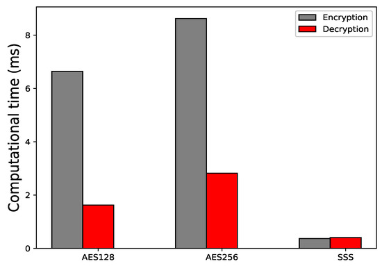 SSS is used in our scenario to split and then encrypt the hashes of file uploaded to IPFS. A comparison between two encryption schemes, i.e., advanced encryption standard (AES) 128 and AES 256. The encryption computational time of both schemes is recorded as 6.64 and 8.62 ms respectively, whereas the encryption time for SSS is 0.37. The significance difference in the computational time of these schemes is because of search space size. AES 128 offers combinations of keys, while AES 256 offer keys. The larger the combination of keys, greater the computational time as shown in Figure 12. In contrast, SSS is showing least computational time because there are no combination of keys. It works as a polynomial function of combination which means the only the defined number of splits are to be encrypted; this is why the computational time of SSS is least as compared to other scheme.