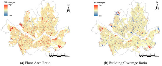 Our data shows that the average ZLST in the study area decreased by 0.01 over the last decade, while the average NDVI increased by 0.09 during the same period, implying an increase in green vegetation and a slight decrease in ZLST. Increases in BCR and FAR over the last decade are also notable and indicate a greater building coverage ratio and higher density in 2014 than in 2004.