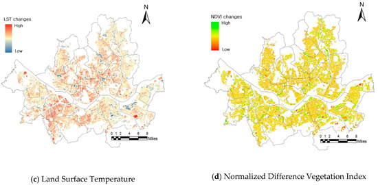 In order to calculate the LST change between 2004 and 2014, we first calculate mean LST values by parcel from the satellite images and convert them into Z-scores ( where x = raw score, μ is the mean of the population, σ is the standard deviation of the population) in order to take the seasonal variations between the image capture dates into account, as suggested by Rogan et al. [43]. Z-scored LST, known as a standard LST score (hereafter named ZLST), is computed by dividing the difference between the observed LST value and the mean by the standard deviation. We retrieve the NDVI from the satellite image by calculating the ratio of near infrared (NIR) and red band in the spectral information, as shown in Equation (1).