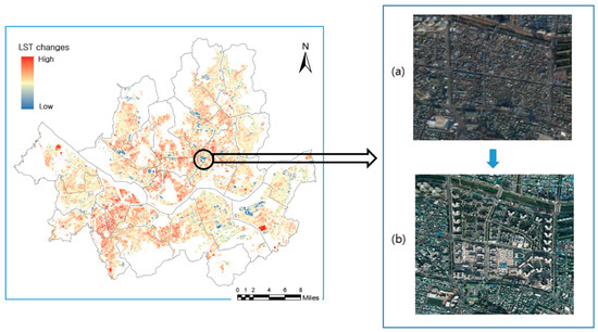 An example of redevelopment site having a significant LST reduction due to densification: (a) single-family housing units in 2008, (b) apartment complexes in 2014. The figure (a) and (b) are captured from Google images (Latitude longitude coordinates for Seoul are 37°33′57.6′′ N, 126°58′42.24′′ E).