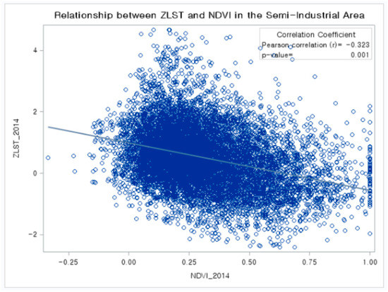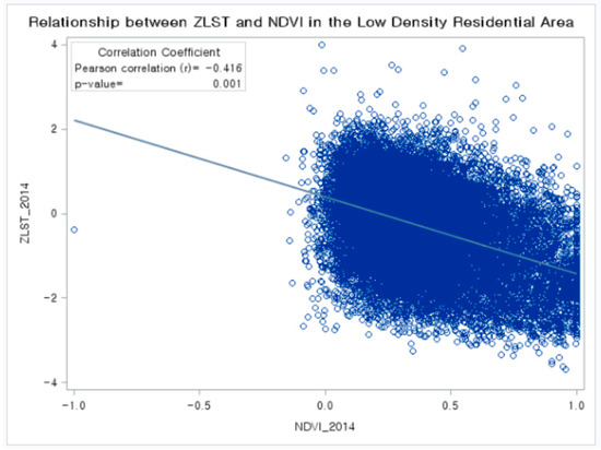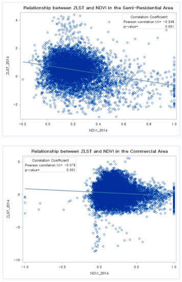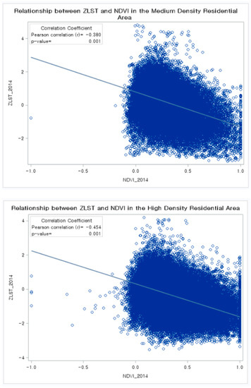 Table 4 presents changes in ZLST and NDVI by land use type between 2004 and 2014. The most significant ZLST change occurred in low-density and high-density residential areas between 2004 and 2014. In 2004, low-density residential areas had the lowest ZLST (−0.664), and high-density residential areas had the second lowest (−0.259). However, their order reverse in 2014 with the largest ZLST reduction in high-density residential areas (−0.156). On the other hand, low-density residential areas experienced the highest ZLST increase (0.367) during the 2004–2014 period. NDVI changes partly explained changes in ZLST caused by land use type. NDVI increases were found in land use types which experienced ZLST drops. This indicates a negative relationship between ZLST and NDVI. This argument is generally supported by Figure 3, showing that ZLST is negatively associated with NDVI for all of land use types at 1% significance level in terms of the Pearson correlation coefficient.