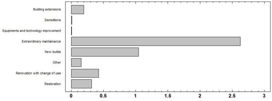 The database is part of the Open Data on Italian public economy and finance collected by the State’s General Accounting Department. Data on the single works are provided by the work’s managers of each public contractor. So, often data are entered incomplete. We excluded projects for which we had incomplete data concerning the costs and each phase of the timeline, thus reducing the sample to 4781 public works. As shown in Figure 1 and Table 1, 55% of the sample (i.e., 2625 projects) are extraordinary maintenance works, while new builds account for only 22% (1047 projects). Renovations of existing buildings involving a change of use amount to less than 9% and restoration work on historical buildings about 6.6%.