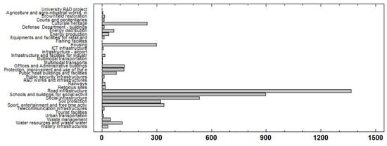 We identified 33 categories of works (see Table 3 and Figure 2) but seven of them accounted for more than 70% of the sample. Road infrastructure is the largest category with 1365 works, followed by school buildings and buildings for social activities. Social infrastructure (urban and neighborhood theaters, libraries and cultural centers) make up 11.15% of the sample. These proportions are consistent with the trend for public works in northern Italy. Countrywide, the availability of public infrastructure varies enormously between north and south [41,42,43], so drawing comparisons on the whole of Italy would be misleading.