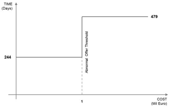 Our elaborations show that even small projects, defined here as public works costing less than €100 million, are liable to time overrun and this stems mostly from the administrative demands of laws and regulations on public works [46,47]. In particular, when we divided our sample into works using the €1 million cutoff for monitoring abnormal offers, the time taken to award public works below the cutoff is 244 days, while it almost doubles to 479 days for those above the cutoff (see Figure 3).