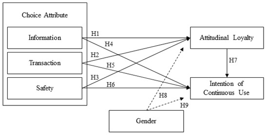 Second, Ahn and Lee [13] analyzed the relationship between perceived value (economic value, convenience value, and emotional value) and usage intention in the research on Internet specialized banks as behavioral models. Convenience value was found to have the most influence on usage intention. They explained convenience value as service convenience (information, accessibility, and ease of transaction, and save time and effort) of Internet specialized banks. Today, financial consumers can easily find differences in customer service between banks through comparison sites, so the choice of service is important. In this regard, the model of the relationship between choice attributes (information, transaction, and safety), attitudinal loyalty, and intention of continuous use can be useful in this field of research. Therefore, users’ needs for Internet specialized banks can be considered as choice attributes, and a differentiated strategy on attributes will be meaningful.