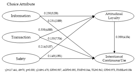 In order to test the proposed relationships among choice attributes (information, transaction, and safety), attitudinal loyalty, and intention of continuous use, structural equation modeling (SEM) was performed using analysis of moment structure (AMOS). SEM can examine the causal relationships among constructs in the model and to test the model against the obtained measurement data to identify how well the proposed model fits the data [57]. It is an appropriate statistical method to examine hypothesized relationships among constructs proposed in this study. Meanwhile, the gender moderating effect analysis of this study used the chi-square difference test of AMOS. The data processing used the SPSS 25.0 and AMOS 21.0 programs.