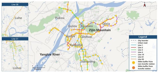 Nanjing, the capital city of Jiangsu province, is the second largest city in East China, after Shanghai. It has a prominent place in Chinese politics, culture, history, education, and commerce. As of 2016, Nanjing accommodated 10.23 million citizens within an area of 6600 km2. The Yangtze River, the longest river in China, flows through Nanjing. Historical relics, monuments, mountains, natural scenic lakes, the Olympic Sports Center, and much more are situated in this both ancient and modern city. Besides, the city also boasts an efficient metro system. With the successful operation of Metro Line 1, Nanjing metro service first started in 2005. By the end of May 2019, the total length of metro lines was 378 km, ranked fourth in China, and seventh in the world. By 2023, fifteen metro lines will be built in Nanjing, with a total length of 578 km [31]. The metro system carried a daily average of 2.7 million passengers in 2017 [2]. The system consists of seven metro lines, covering 118 non-transfer stations and 10 transfer stations, as shown in Figure 1. According to the administrative districts of Nanjing, urban, suburban, and exurban areas were then designated [32,33]. Gulou, Xuanwu, and Qinhuai districts were designated as urban areas. Jianye, Yuhuatai, Pukou, Jiangning, and west of Qixia were suburban areas. Luhe, Lishui, and east of Qixia were exurban areas.