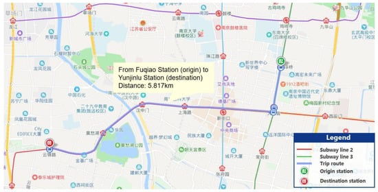 Baidu Map, one of the largest digital maps in China, could provide the route of each trip in its “route search” module based on the shortest path [34]. We may obtain the network distance of each trip by inputting the origin station and the destination station. Researchers have found this module is very reliable and intelligent in outputting up-to-date traffic information [35]. We thus designed a program to connect massive O-D pairs with the “route search” module and automatically calculated the network distance of each trip through the Baidu Map application programming interface (API). Figure 2 shows an example of a typical search. The network distance from Fuqiao Station (origin) in Subway Line 3 to Yunjinlu Station (destination) in Subway Line 2 is 5.817 km.