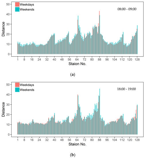 The variability of station-based travel distances is of fundamental importance to understand mobility patterns and the influences of the built environment. To identify the travel distance from place to place and from time to time, each trip record was projected into the spatial and temporal scale by aggregating station number and swiping time, respectively. Due to the space limitation, Figure 3 shows the bar graphs of travel distances from 08:00 to 09:00 and from 18:00 to 19:00 on weekdays and weekends. The x-axis is the station number and the y-axis is the average travel distance from the metro station in three weeks.