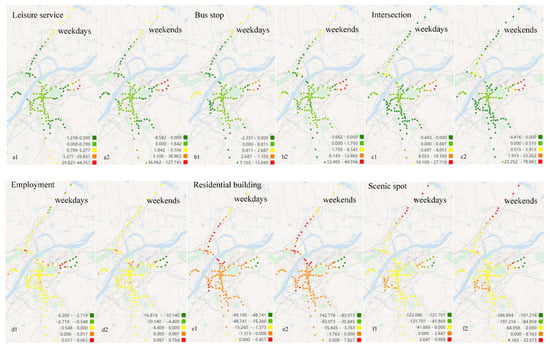Spatial relationships between travel distances and built environment can be depicted for visual analysis through local coefficient estimates. Due to space limitation, leisure services, bus stops, intersections, employment, residential buildings, and scenic spots were visualized to reflect the effects of built environment, as shown in Figure 4. In this paper, the Jenks natural breaks classification method was used to determine the best arrangement of estimated coefficients into different classes. This method can minimize the average deviation of coefficients within classes and maximize the deviation between classes. Based on this method, the paper also manually sets zero as a breakpoint to differentiate the positive effects and negative effects. The general spatial variations of these six variables were similar between weekdays and weekends. It indicated that the positive and negative effects of built environment on travel distances were consistent in a week. Suburban and exurban areas imposed greater influences on travel distances, as depicted by the color of stations in Figure 4. Different from the mixed land use in the urban areas, suburban and exurban areas are usually characterized by single land use. Travel distances of people who live in remote areas are more sensitive than those living in the urban area.