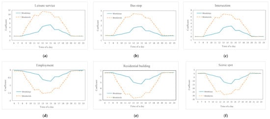 Temporal distribution of the coefficients for built environment: (a) leisure service; (b) bus stop; (c) intersection; (d) employment; (e) residential building; (f) scenic spot.