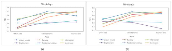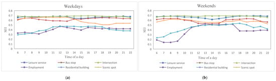 Average spatial and temporal features of coefficients were studied and discussed in previous sections. As positive and negative effects may be compensated by averaging, SEI was used in this paper to further quantify the degree of heterogeneity of built environment effects. The results of spatial and temporal heterogeneity are shown in Figure 6 and Figure 7, respectively. As to spatial heterogeneity at the temporal scale, leisure services and intersections both had significant spatial heterogeneity. The influence of intersections on travel distances remained stable without obvious fluctuations. The positive and negative effects of intersections around metro stations varied throughout the day. Different from other variables, connectivity represented by intersections generally did not vary with time. SEI of leisure services, bus stops, and scenic spots all declined at the beginning and rose up later. SEI of employment and residential buildings all exhibited an upward trend, then a downward trend. The findings reflect an obvious difference between non-commuting activities and commuting activities. The effects of non-commuting activity on travel distances are more heterogeneous than commuting activity at the spatial dimension. Meanwhile, the commuting activity on weekends also indicated a different fluctuation range, probably because many people do not have to work as usual on weekends. Others going to work may not necessarily obey the working time that is more flexibility on weekends.