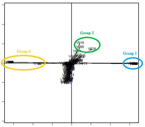 The first step before performing the CATPCA algorithm is to codify the categorical results as numbers. For example, if one variable has three different categories, we codify them as 1, 2, and 3. For our analysis, we use 1~NULL, 2~TRUE, and 3~FALSE, but any other combination (such as 0, 1, and −1, as we tried to define in the previous section) leads to the same result after the finalization of the CATPCA algorithm, although the simplest 1,2,3 combination is preferred on the algorithm. Thus, we use CATPCA to transform the categorical variables into numerical variables. That is, we obtain a sequence of column vectors vj for j = 1, …, J with length bj, as the scores for the categories of each one of the variables.
