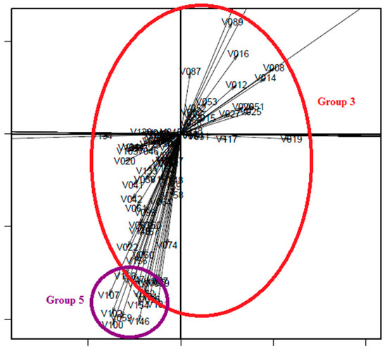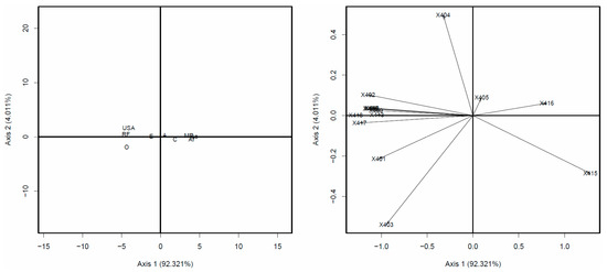 Figure 4 shows that Asia, Africa, the Middle East, and Latin America are located on the right semi-plane. Therefore, they are more closely related to the indicators on the right side: public policy (X415), customer health (X416), and, although its vector is quite short, diversity and equal opportunities (X405). The other indicators, appearing in the left semi-plane, are of little importance. Conversely, the Russian Federation, Oceania, the United States, and Europe appear on the left semi-plane, indicating the increased importance of the other 12 GRI indicators also appearing in the left semi-plane.