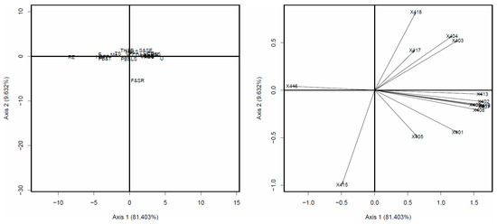 Figure 5 shows that the GRI indicators public policy (X415) and customer health (X416) appear together on a semi-plane—the left semi-plane in this case. The corresponding sectors, which also appear in the left semi-plane are real estate; energy; diversified financials; household and personal products; food, beverage, and tobacco; materials; telecommunication services; technology hardware and equipment; transportation; media; and pharmaceuticals, biotechnology, and life sciences. We obtain the same indicators because these industries are related to the countries in the right semi-plane of Figure 4. These results support the findings of both Sobhani et al. [28] and Gallego-Álvarez et al. [29].