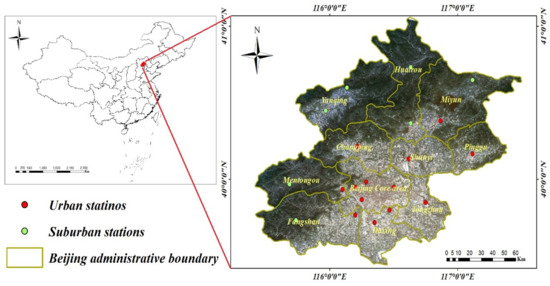 Beijing City, the political and cultural center of China, is located at 39°26′–41°03′ N and 115°25′–117°30′ E (Figure 1), and occupies a land area of 16,800 square kilometers. The city has a temperate monsoon climate, with mild winters (annual minimum temperature is −2.37 °C) and moderately hot summers (annual maximum temperature is 25.4 °C). The northern and western part of the city is mountainous (near the Taihang Mountains and the Yanshan mountains), with an elevation of 200–1000 m. The central and southern part is located in the North China plain and has been well developed.
