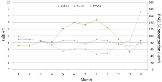 In order to analyze the temporal dynamics of CUHII, SUHII and PM2.5, their monthly mean values in 2015 were calculated and shown in Figure 2.