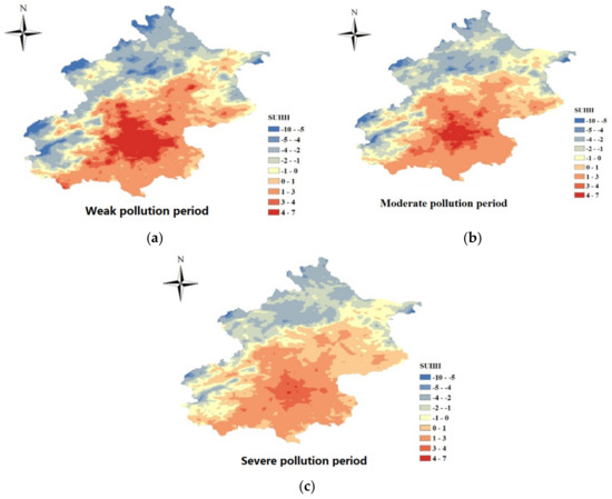 The spatial distribution of SUHII (surface urban heat island intensity) under different PM2.5 levels. (a) SUHII under light level; (b) SUHII under moderate level; (c) SUHII under serious level.