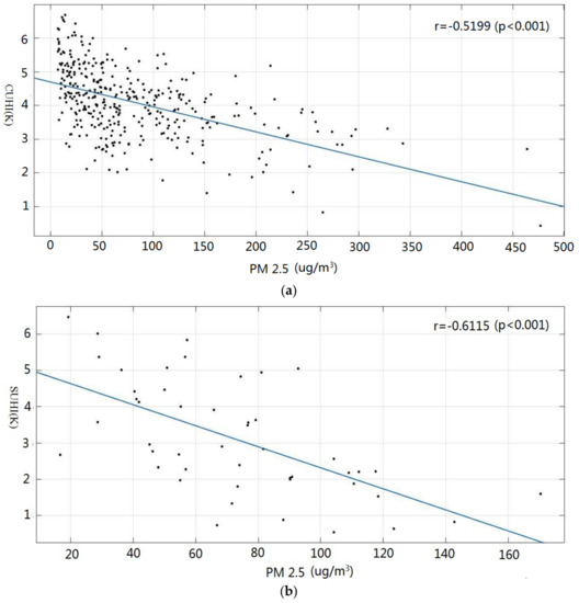 In this study, the Pearson correlation coefficient was used to investigate the impacts of PM2.5 concentration on CUHII and SUHII. The Pearson correlation coefficient, also referred to as Pearson’s r, is a measure of the linear correlation between two variables X and Y. According to the Cauchy–Schwarz inequality, it has a value between +1 and −1, where 1 is total positive linear correlation, 0 is no linear correlation, and −1 is total negative linear correlation. The formula for the Pearson correlation is shown as below: