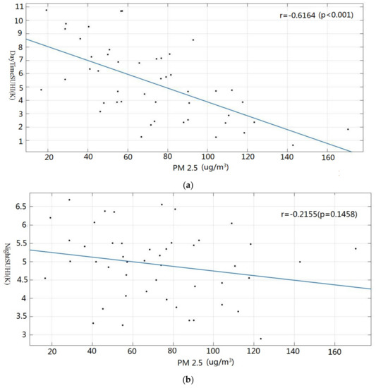 As both daytime SUHII and nighttime SUHII were available, the impacts of PM2.5 on them were also investigated and shown in Figure 5. The daytime SUHII and PM2.5 concentration are scatter-plotted in Figure 5a, while the nighttime SUHII and corresponding PM2.5 concentration are scatter-plotted in Figure 5b. The Pearson correlation coefficient between CUHII and PM2.5 was −0.6164 with p < 0.001, which indicates there was a significant negative correlation between PM2.5 and daytime SUHII. High PM2.5 concentration might weaken the daytime SUHII to some extent. On the other hand, the Pearson correlation coefficient between nighttime SUHII and PM2.5 concentration was just −0.2155 with p = 0.1458, which means there was no significant correlation between them.