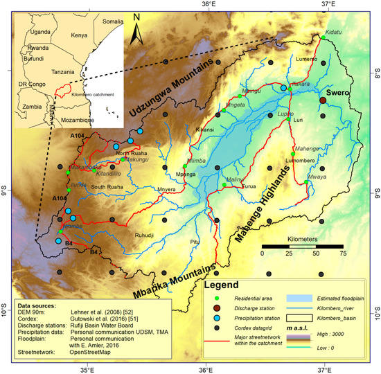 - Näschen, K.; Diekkrüger, B.; Leemhuis, C.; Steinbach, S.; Seregina, L.; Thonfeld, F.; van der Linden, R. Hydrological Modeling in Data-Scarce Catchments: The Kilombero Floodplain in Tanzania. Water 2018, 10, 599. [Google Scholar] [CrossRef]