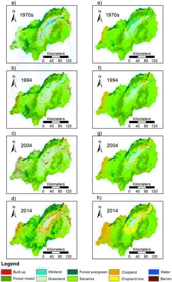 Land use and land cover classifications for four time steps ranging from the 1970s (a,e), 1994 (b,f), and 2004 (c,g) up to 2014 (d,h). Some differences among the LULC maps in the right and in the left column exist due to the classification process: Only the maps in the left column contain “barren” as a land use class, but they have only one LULC “cropland”, whereas the maps in the right column differentiate in between “cropland” and “cropland-rice” as a specific crop.