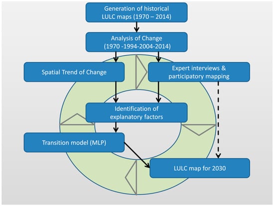 One of the main objectives of this article is to analyze the impact of LULCC on water resources until 2030. Therefore, scenarios of LULC for 2030 were developed using a mixed method approach containing land use change modeling, expert interviews, and a participatory mapping exercise in the framework of a workshop with local experts (Figure 3). The main goal of developing the 2030 scenarios was to identify implications of potential future LULC distributions on water resources in order to determine hot spots of change regarding water resources. In a first step, the historical LULC distributions from the 1970s until 2014 were derived from Landsat images (see Section 2.2). The Land Change Modeler LCM [31,32,69,70], within the Terrset Software Version 18.31 utilizing the IDRISI GIS System [32], was used to analyze the changes of LULC classes among the available historical products from the 1970s until 2014 (“Analysis of Change”, Figure 3).